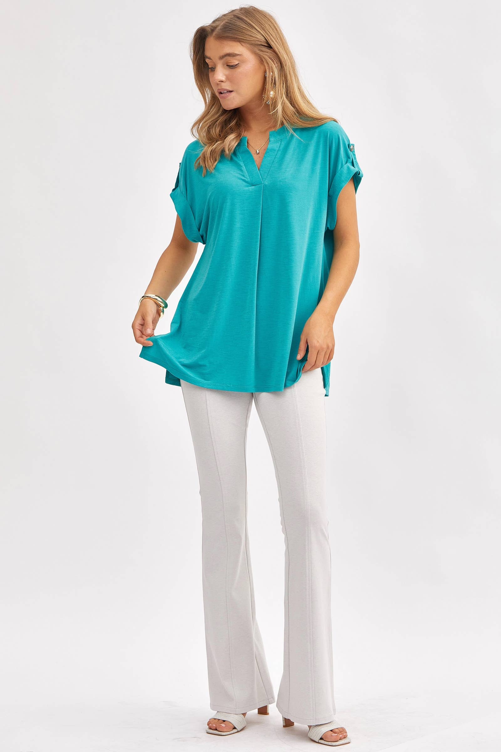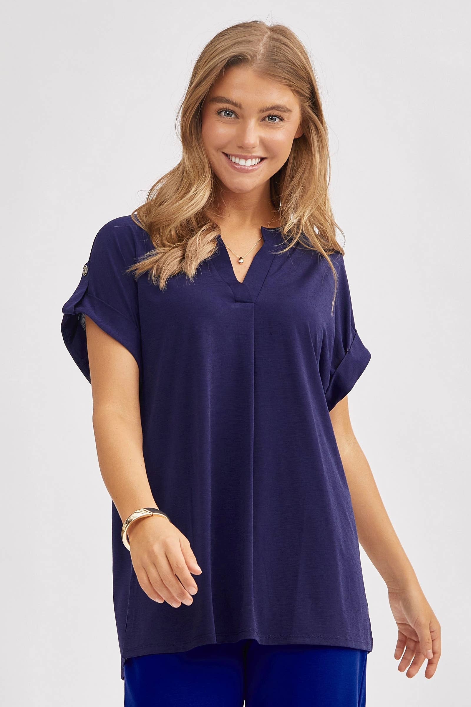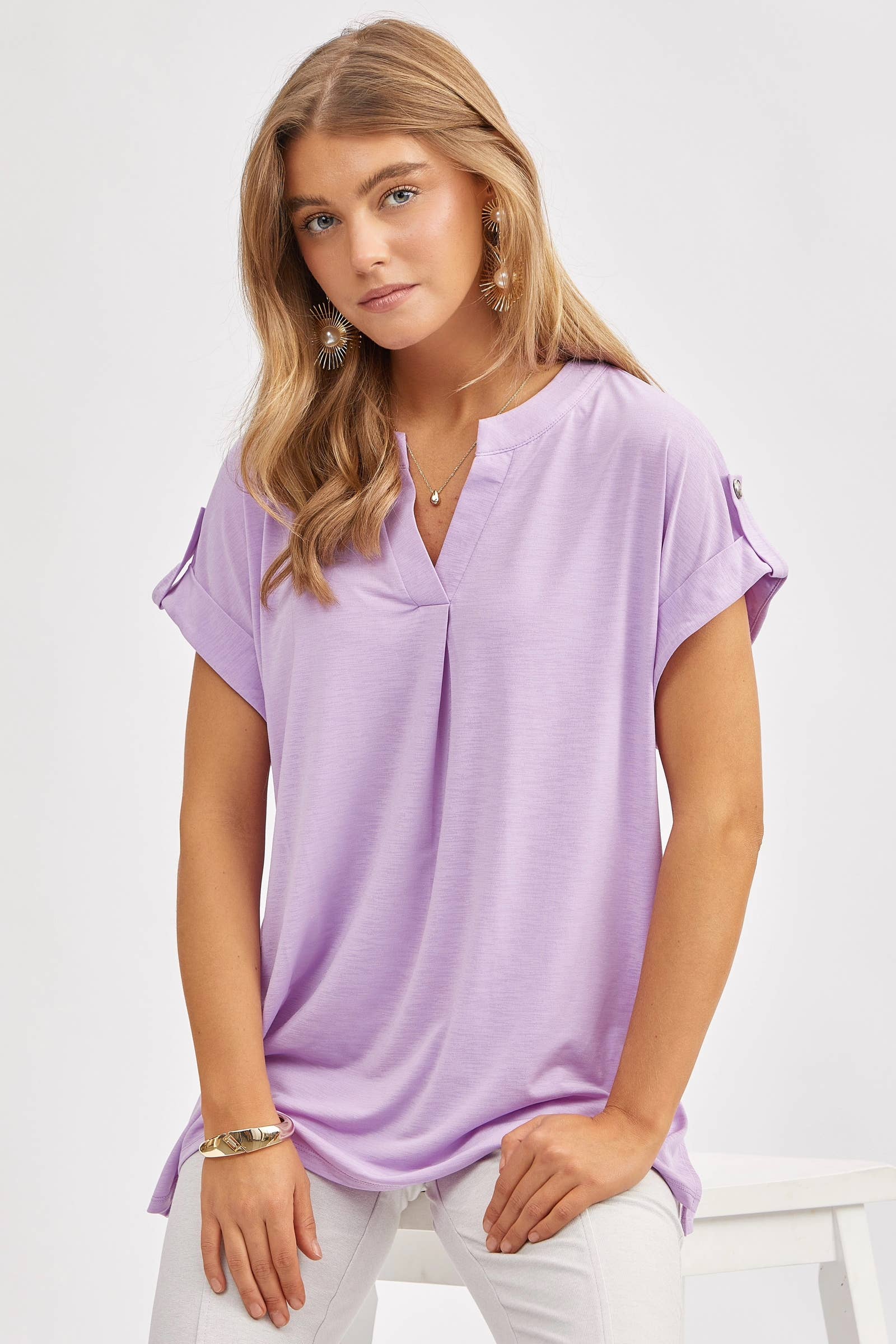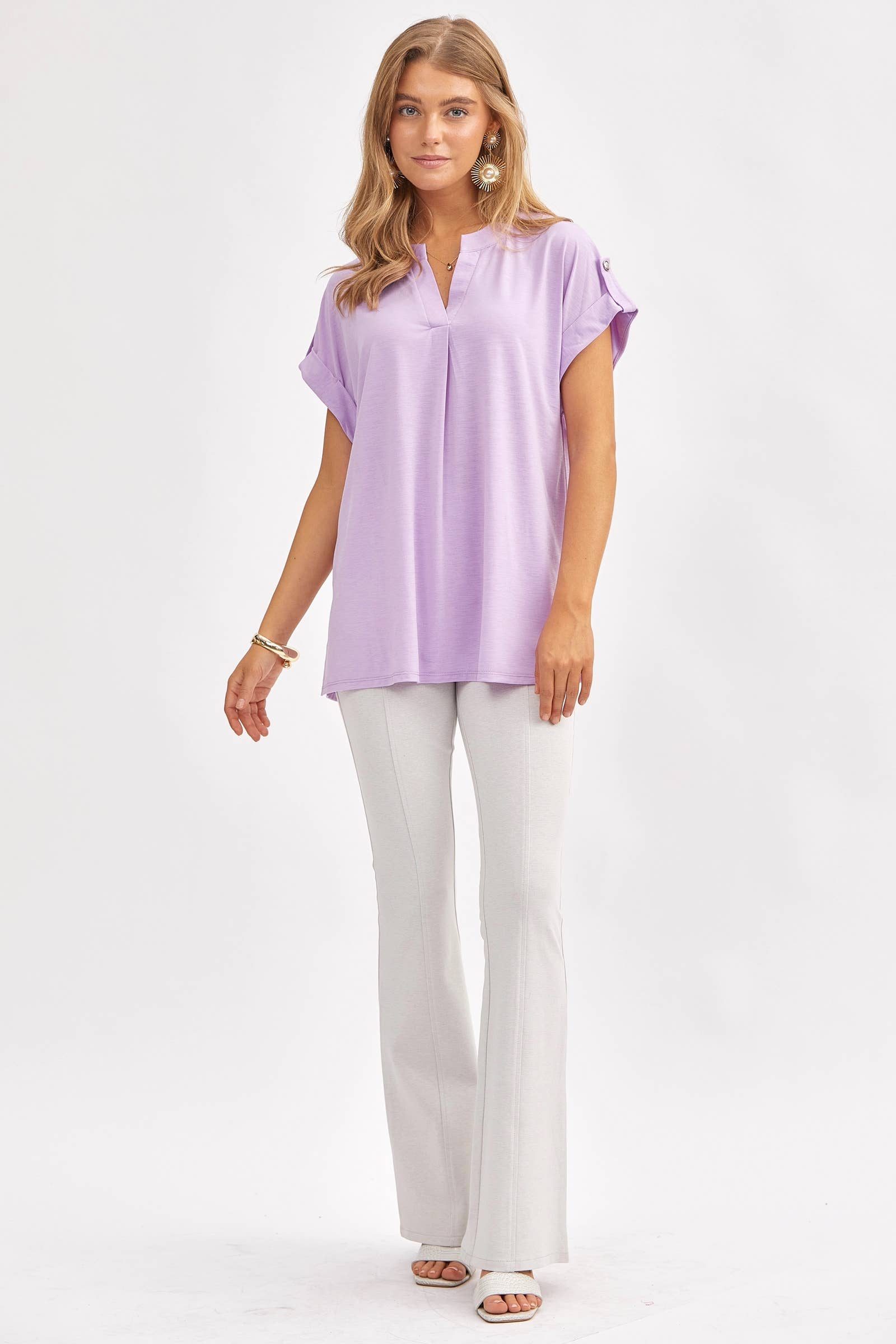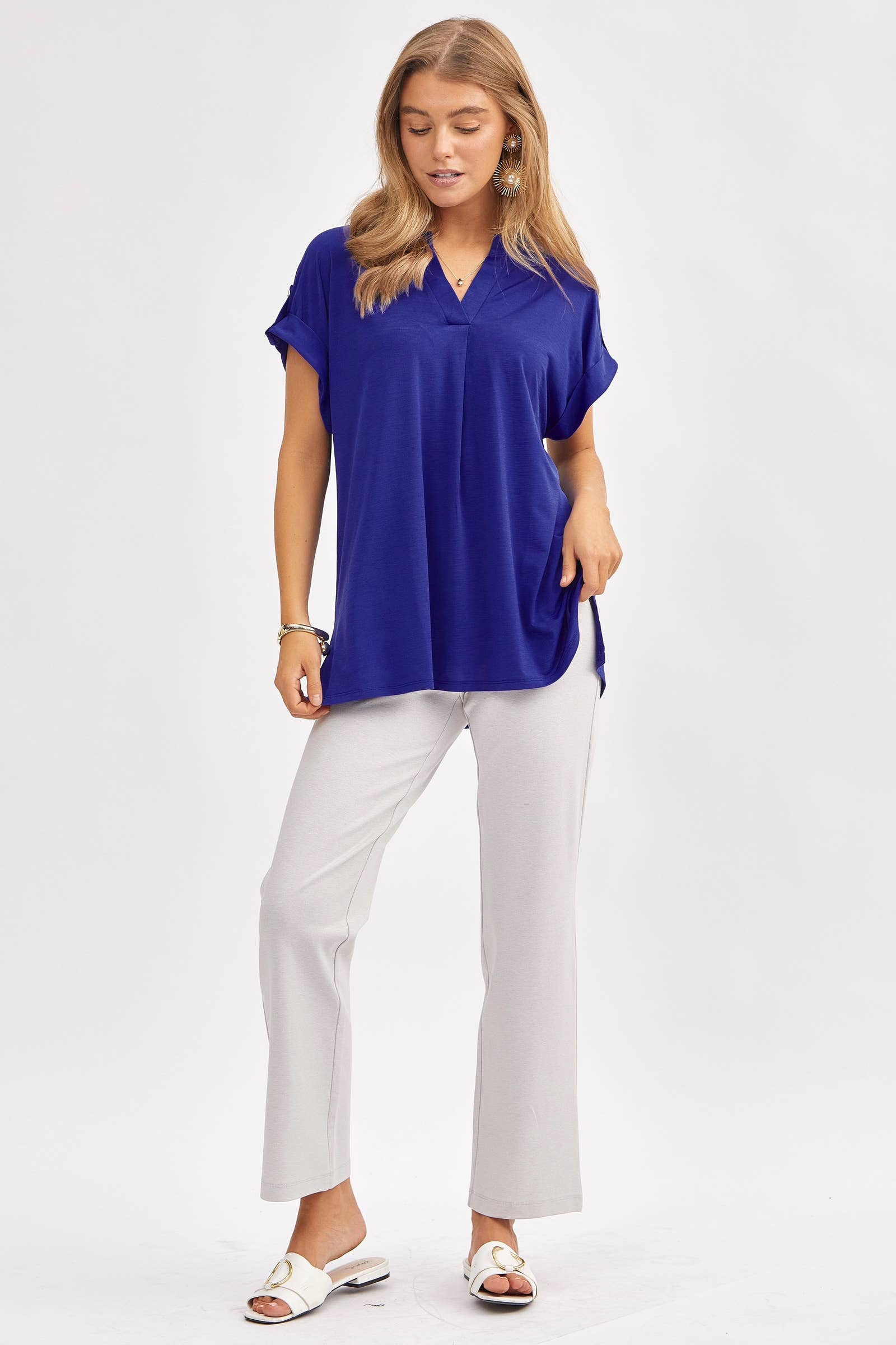 This stylish dolman short-sleeve top features a sophisticated mandarin collar adding a touch of elegance to this relaxed silhouette. It's comfortable, easy care, with a laid back vibe. Non sheer, stretchy, wrinkle-free.