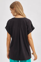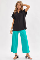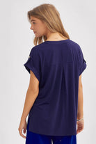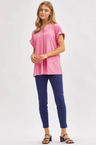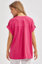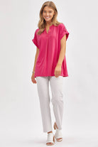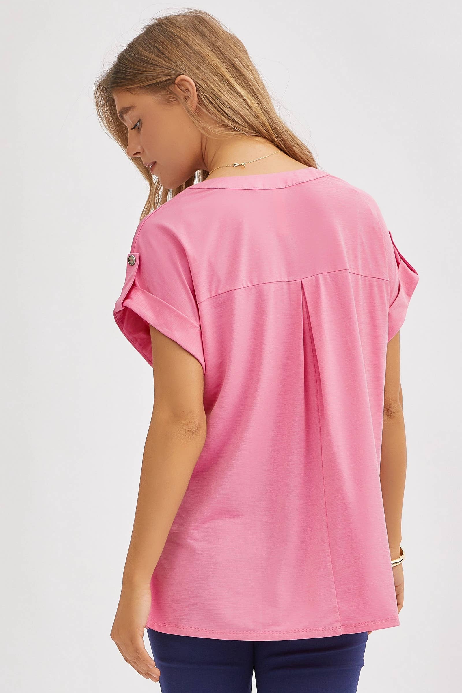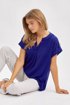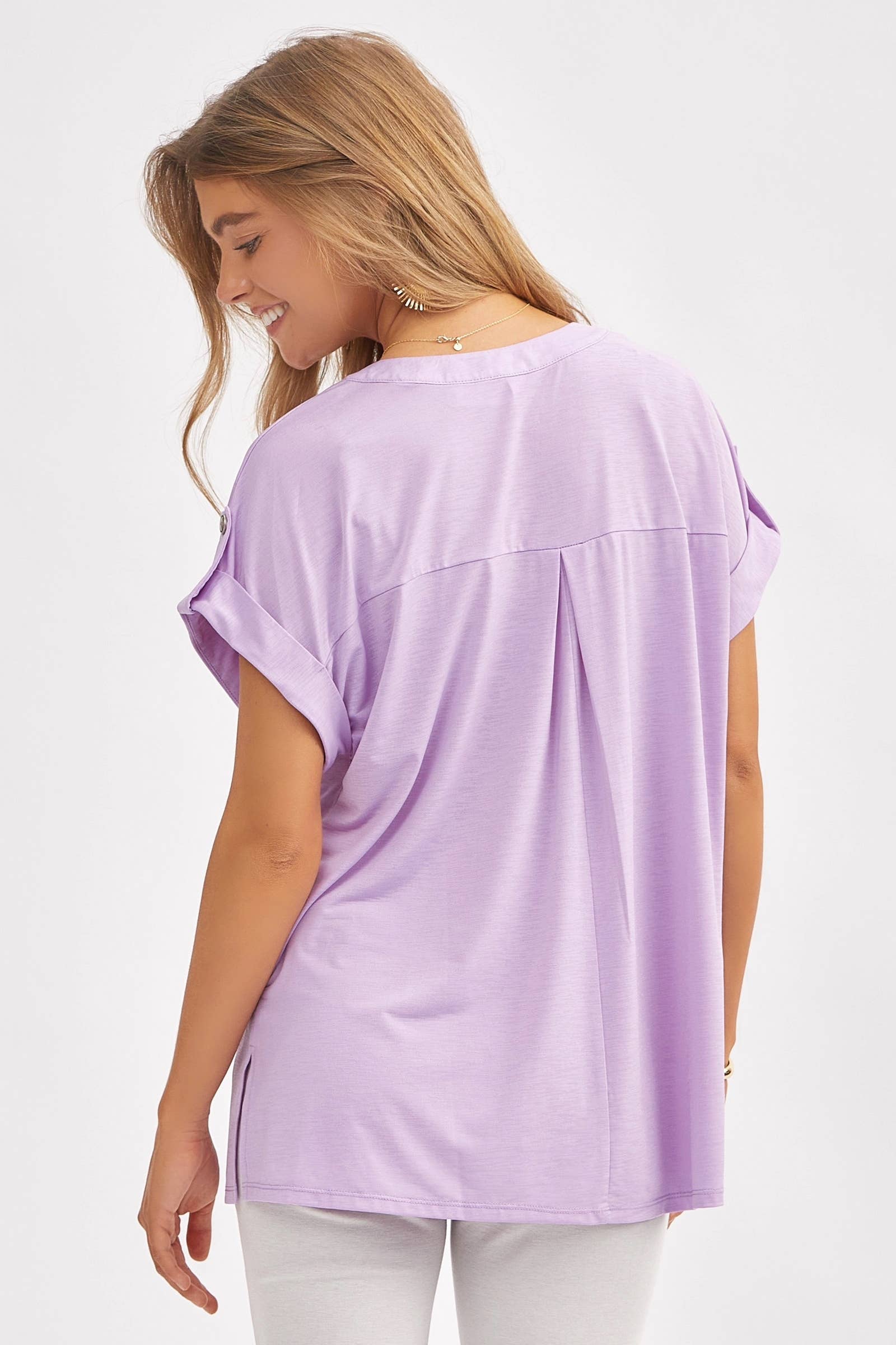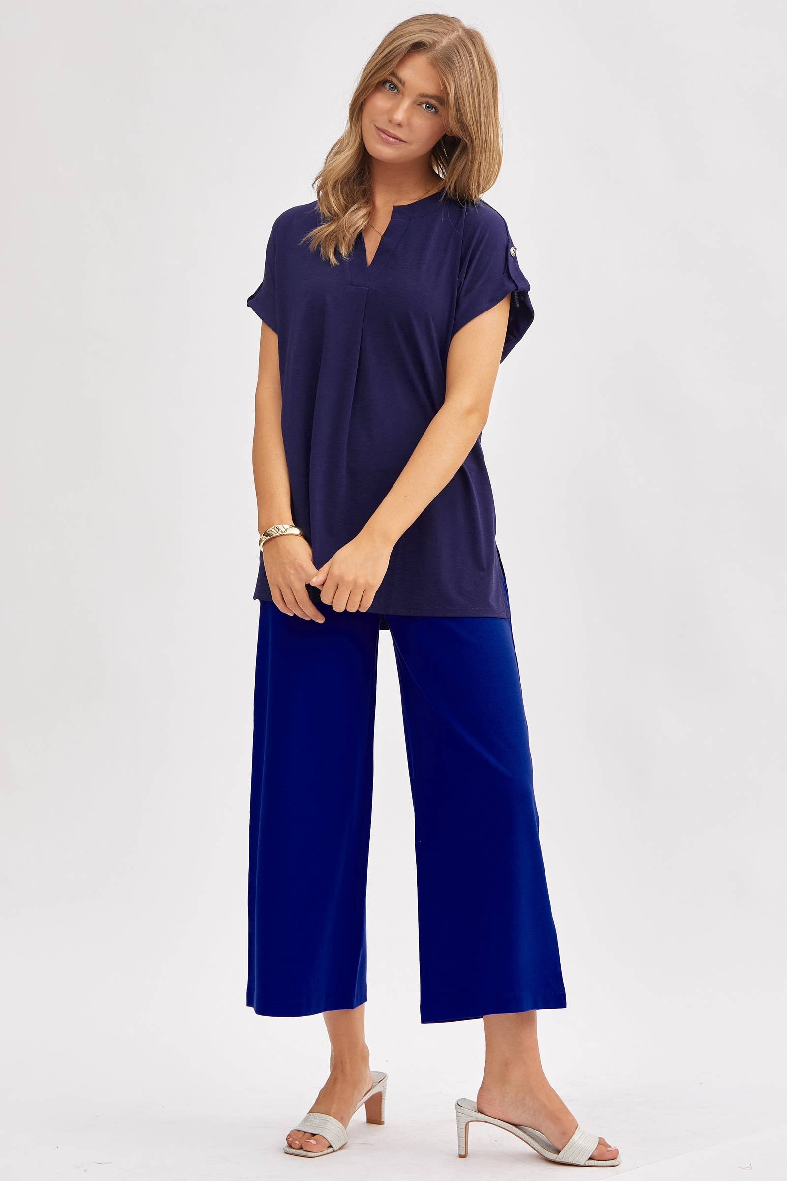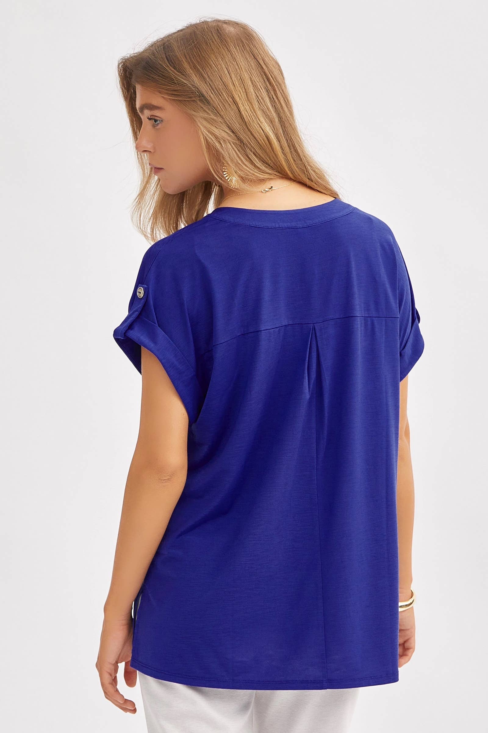 This stylish dolman short-sleeve top features a sophisticated mandarin collar adding a touch of elegance to this relaxed silhouette. It's comfortable, easy care, with a laid back vibe. Non sheer, stretchy, wrinkle-free.