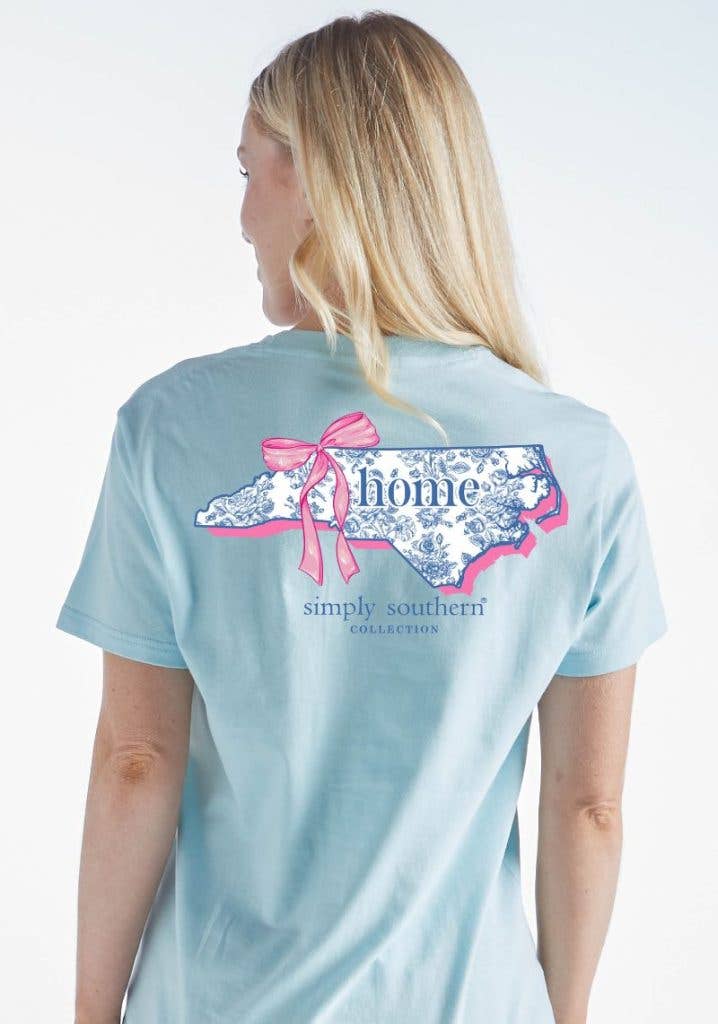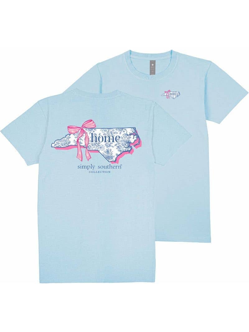 Ice blue short sleeve shirt with the shape of North Carolina in vintage blue floral pattern.The word 'home' in the center of the state, there is a pink bow on the top left of the state. Simply Southern logo below. Similar design on left chest. Pre-shrunk and ring-spun 100% cotton. Unisex sizing.