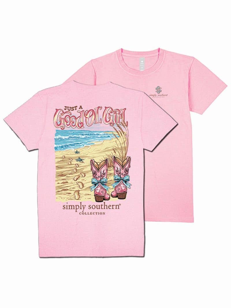 Fancy candy pink short sleeve shirt with the phrase 'Just a good ol' girl' and a beach scene a pair of cowgirl boots at the start of a footprint path in the sand. Simply Southern logo below and on left chest. 100% cotton. Unisex sizing.