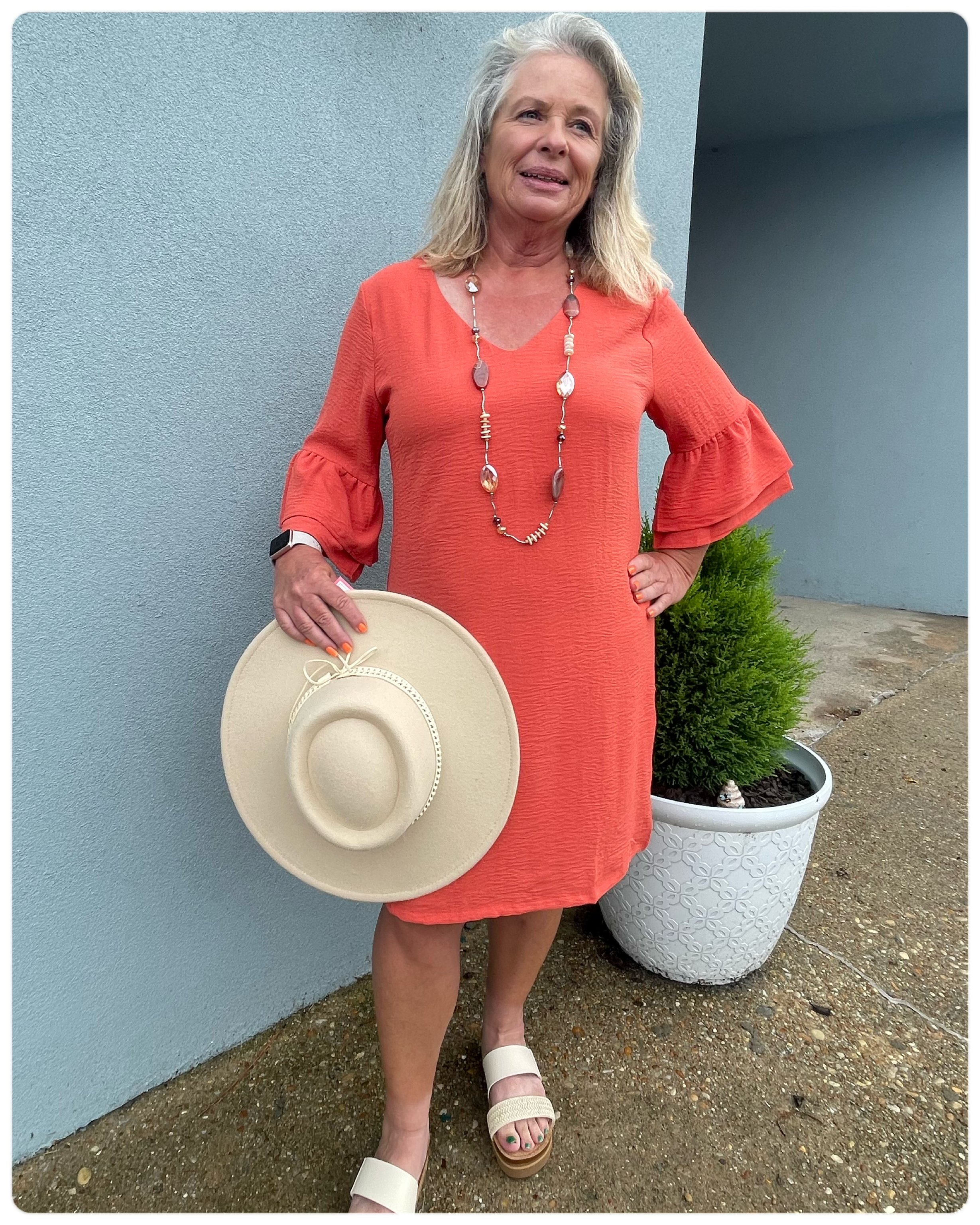 Meet Stephanie, the 100% Polyester dress that's fully lined and features a v-neckline and zipper closure. It's the perfect burnt orange addition for your fall wardrobe and pairs perfectly with our new Corky Sandals.