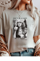 Embrace your legendary side with this super soft Stevie Nicks T-shirt! Featuring the cheeky phrase "Don't be a lady, be a legend," it’s perfect for adding a playful edge to your everyday look while staying cozy and comfortable.