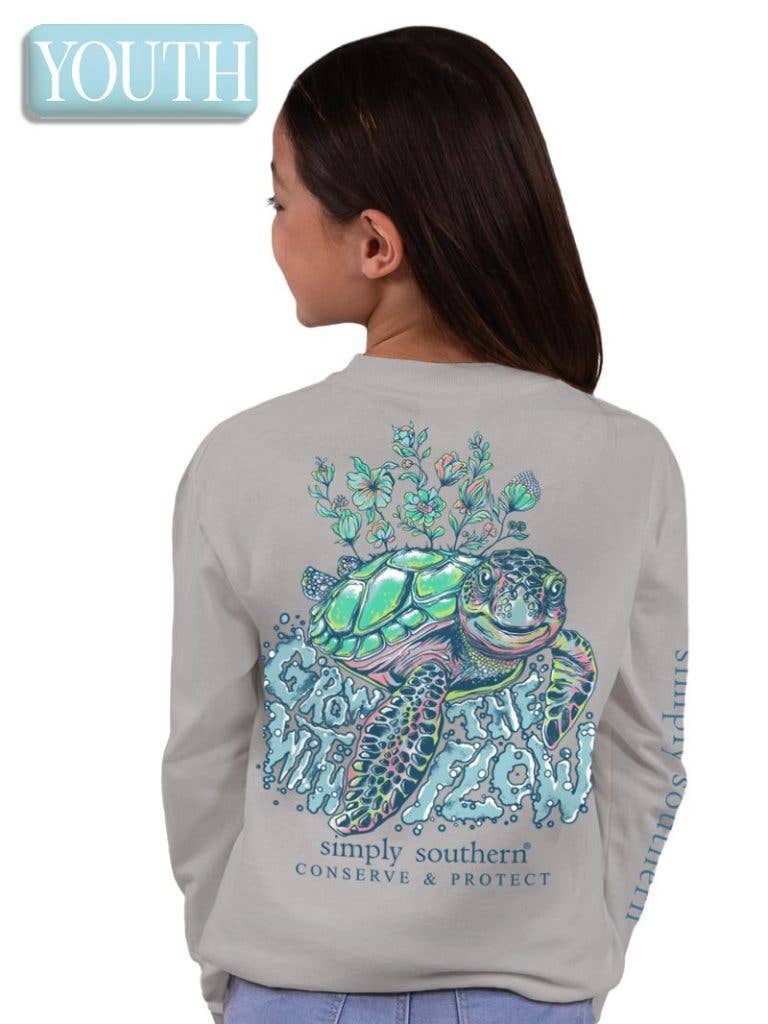 Light grey long sleeve shirt with the phrases 'Grow with the flow' and 'Conserve and Protect' and a sea turtle swimming along with flowers on his shell. Simply Southern logo below, on right sleeve, and on left chest. 100% cotton. Unisex sizing. Track shirt.